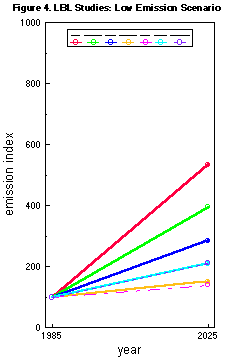 The LBL high emission (reference scenario) shows a variation from a high six-fold increase for India, five-fold increase for Indonesia and an increase of between two and three times for China, Argentina, Brazil, Mexico and Venezuela. In the low emission (abatement scenario) the emissions are projected to grow by only about 50% from present levels in Brazil after a 54% reduction, and in Argentina after about 25% reduction. China, Mexico and Venezuela project emission increases between a doubling and tripling of present today's level after 20% to 30% baseline reductions. India and Indonesia project after the high reference emissions also a persistent high abatement emission level amounting to a four to five-fold increase from present after very small reductions of 13% and 18% from baseline, respectively.