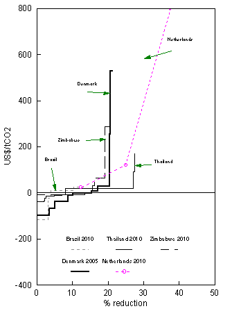 The exhaustion of low-cost options (i.e. marginal cost less than $20-30 per tonne CO2) is reached at about 30% reduction from baseline in 2025 for Brazil, about 10% reduction for Thailand, about 25% reduction for Venezuela and at about 35% reductions for Zimbabwe. It is likely that the exhaustion of such low-cost options could have been followed by a more gradual increase in costs if more abatement technologies with higher costs were included. Examples of such intermediate-cost options might be renewable energy technologies and additional end-use savings. Consequently a larger reduction interval could probably be achieved without such a steep increase in marginal abatement costs.