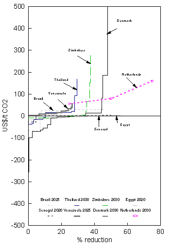 The long-term marginal cost curves shown in Figure 6 show many similarities for the developing countries in line with the short term curves. Venezuela may be regarded as an exception due to entirely positive curve which arises from the inclusion of all "no-regret" options in the baseline.