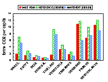 The country studies show substantial differences in terms of the amount of CO2 emissions per capita (Figure 1). For example, in Thailand the per capita emissions in the reference case are projected to increase by a factor of six, while in Senegal and Zimbabwe they are assumed to stay roughly constant. Comparison in absolute terms reveals a huge variation among the countries: CO2 emission levels per capita in Thailand are expected to exceed by more than 20-fold those of India and reach the levels of the industrialized countries by 2030.