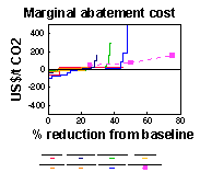 The abatement cost varies with the degree of reduction. Cost curves, such as those in Figure 2 where marginal costs for several target reductions in a specific year are plotted, illustrate this variation for a number of participating countries. It should be noted that in this representation each point on the curves represents a complete energy system solution, rather than the result of an individual abatement option.
