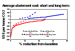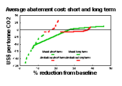 The average abatement cost curves illustrate the time dependence of abatement cost: at later times, more percentage reduction is achievable for the same cost, and the slope of the cost curve decreases. In other words the long-term curves are in general lower and flatter than the short-term ones. This reflects the fact that increasing opportunities for capital replacement allow the use of more efficient and less polluting energy technologies in both new and replacement applications.