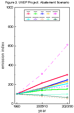 The UNEP reference emissions show a large variation ranging from a six to eight-fold projected increase, for Thailand and Brazil, and to a two to three-fold increase for the other developing countries. In the abatement scenario, after the 30% reduction from baseline, Thailand still projects a six-fold increase in emissions, and Brazil project a three-fold increase after a 50% reduction. The rest of the developing countries project emission increases up to a doubling in the abatement scenario after a 40%-50% reduction in 2020/30. The high emission projections for Thailand and Brazil in the reference and abatement scenario can be explained by a large contribution of fossil fuels in the supply system. In addition the Thailand study includes very low expectations for energy efficiency improvements.