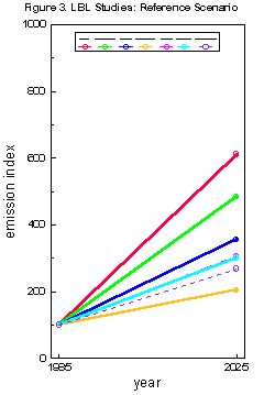 The LBL high emission (reference scenario) shows a variation from a high six-fold increase for India, five-fold increase for Indonesia and an increase of between two and three times for China, Argentina, Brazil, Mexico and Venezuela. In the low emission (abatement scenario) the emissions are projected to grow by only about 50% from present levels in Brazil after a 54% reduction, and in Argentina after about 25% reduction. China, Mexico and Venezuela project emission increases between a doubling and tripling of present today's level after 20% to 30% baseline reductions. India and Indonesia project after the high reference emissions also a persistent high abatement emission level amounting to a four to five-fold increase from present after very small reductions of 13% and 18% from baseline, respectively.